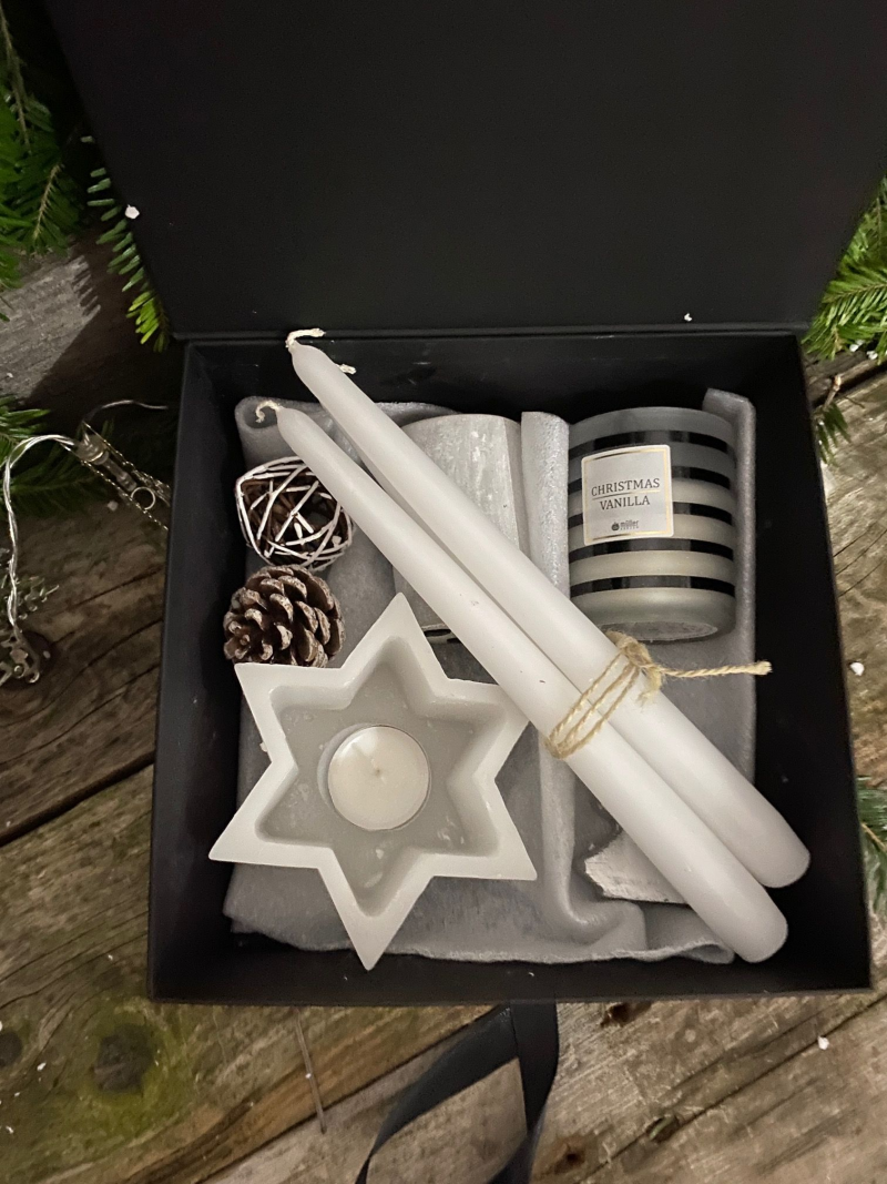 Set cadou Xmass Elegance. Contine 8 piese : Bol ceara stea cu pastila alb 1 buc ,lumanare conice in celofan alb 3 buc,suport sfesnic beton -1 buc, lumanare parfumata( vanilie ) in pahar Rhonda -1 buc , lumanare brad craciun argintiu-1 buc , accesorii -con brad ...