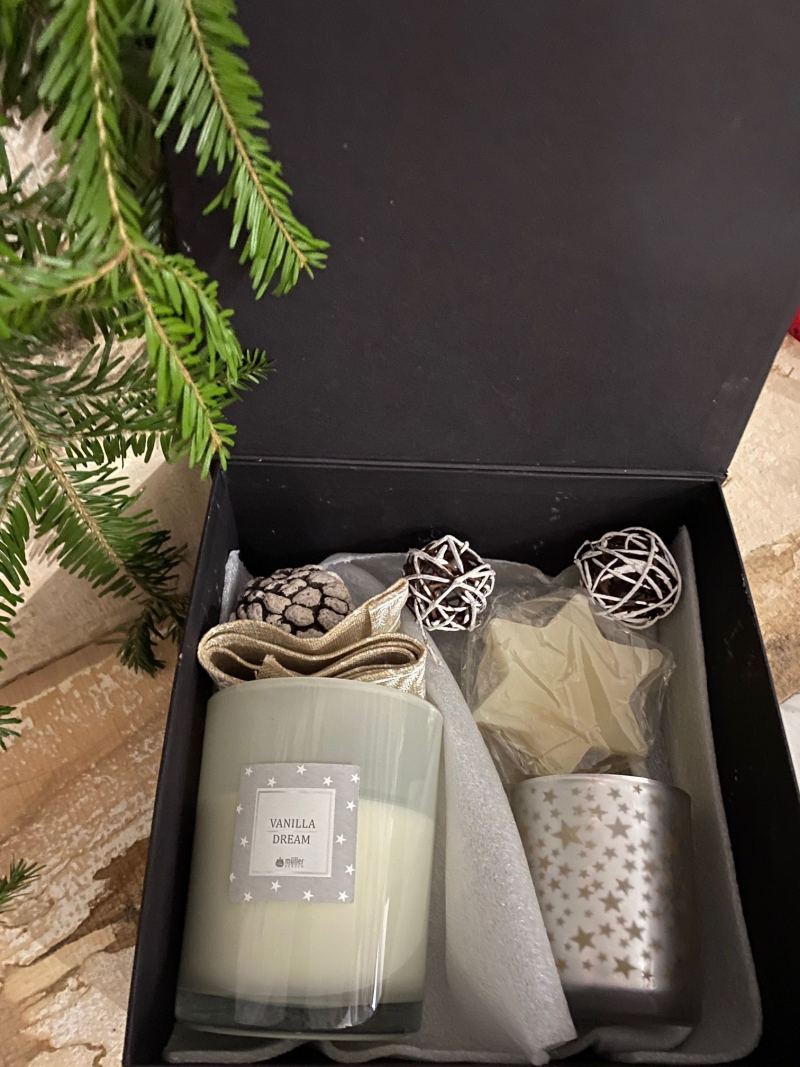 Set cadou Star dust crem/auriu. Contine : Lumanare maxi parfumata -vanilie-1 buc , lumanare stea 1 buc , vas sticla Star dust -1 buc , pastile parfumate -1 buc , si mici accesorii .